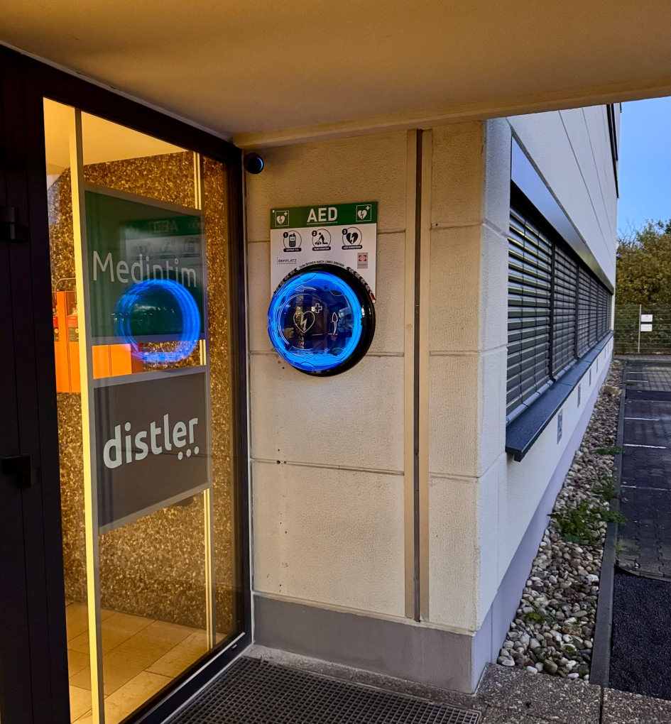Der Defibrillator wird in einem RORAID 24/7 Wandschrank aufbewahrt.